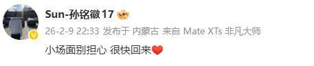 2月9日22时,伤情确诊后,孙铭徽在社交媒体发布一条仅10字的动态:“小场面别担心,很快回来。”没有抱怨,没有煽情,没有自怜。这条微博,被转发超12万次,评论区满是“等你回来”“加油,铭徽”“浙江需要你”。