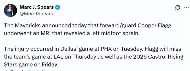 北京时间2月12日,独行侠官方宣布,状元弗拉格接受了核磁共振检查,结果显示为左脚中部扭伤。这次受伤发生在周三独行侠客场对阵太阳的比赛中。弗拉格将缺席周五对阵湖人的比赛,也不会参加周六举行的2026年全明星新星赛。